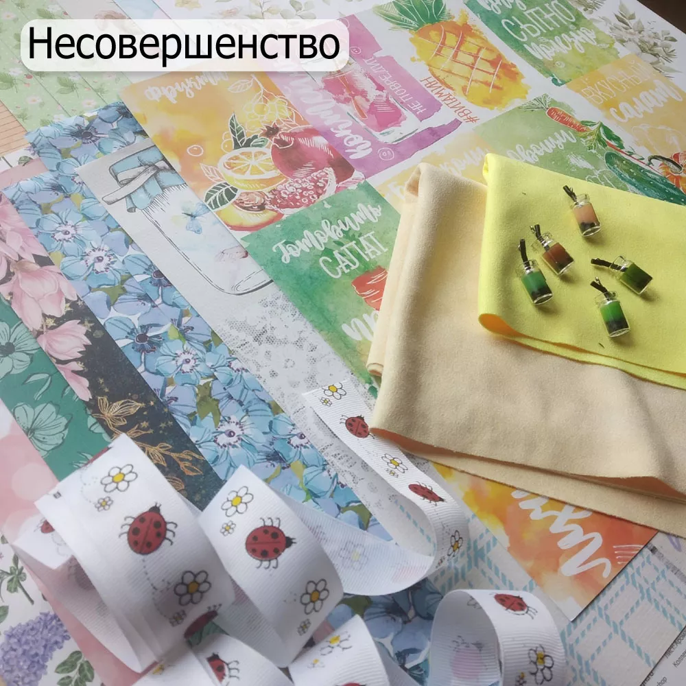 В комплекте 19 листов бумаги 30х30 см (замятия, надрывы), 2 отреза микрозамши (нестандартный размер, пятна), лента (нестанд.размер, пятна), 1 вощеный шнур (нестанд. длина), набор полубусин (некомплект), набор подвесок (трещины). Брак. Претензии по качеству не принимаются
