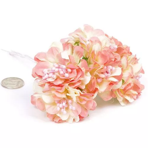 В наборе 6 пионов из ткани с тычинками в центре на стебельках, длина 11 см. Диаметр цветка 5,5 см, высота 3 см