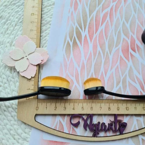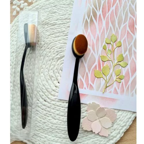 Кисть используется для создания фонов, тонирования краев бумаги, вырубки. Имеет очень плотные ворсинки, благодаря которым хорошо растушевывает сухие краски, оттенки штемпельных подушечек. Используется в цветоделии для тонирования серединок или краев цветов. Длина инструмента 15 см, размер кисти 3х1,7 см