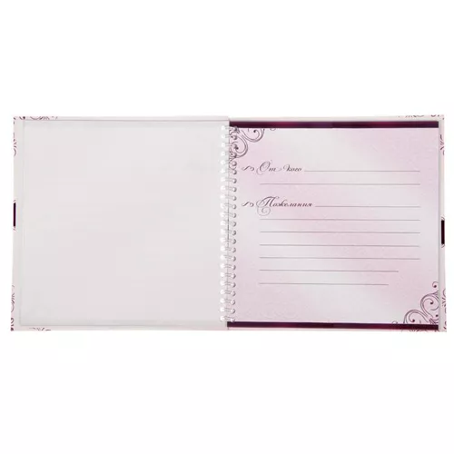 Размер книги 22х21 см. Внутри 40 разлинованных листов, скрепленнных пружиной. В комплект входит ручка с пером, которая подчеркнет торжественность события