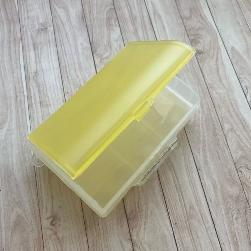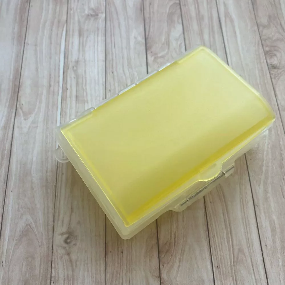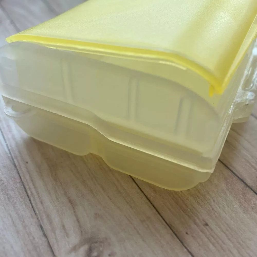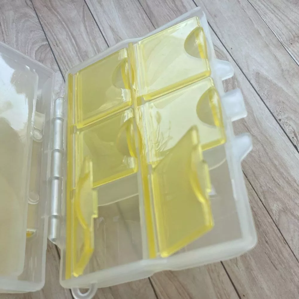Двусторонний контейнер с желтой крышкой. С одной стороны 1 ячейка, с другой стороны 6 ячеек с отдельными крышечками, очень удобен для хранения разных мелочей. Размер 9,2х7х3 см