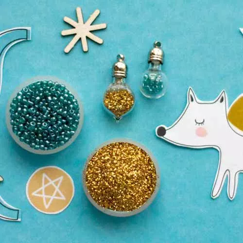 В наборе упаковка с золотистым глиттером, упаковка с бисером и 2 бутылочки с металлической крышкой