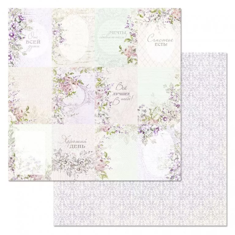 В наборе 12 двусторонних листов разного дизайна, в том числе 3 листа с картинками для вырезания. Плотность 180 гр/м2. Легкой дымкой рассветного тумана, чуть звеня воздушным умиротворением, на бумагу опустилась цветочная вуаль. Нежностью сиреневых цветов она окутала мысли и мягкой зеленью легла в основу идеи коллекции. Прикоснуться к бесконечности воздуха и ощутить счастье на кончиках пальцев - это бесценно...