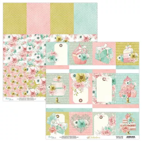 В наборе 12 двусторонних листов, каждого дизайна по 2 листа. Приятным бонусом станут картинки для вырезания на обратной стороне обложки. Какой праздник без торта, шариков и цветов? В этой коллекции найдется все это! Приятные розово-мятные приглушенные цвета и великолепные фоновые принты помогут вдохновиться и скрапить целыми днями