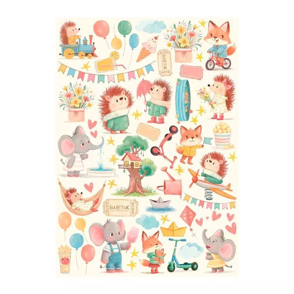 В наборе 6 двусторонних листов с фоновыми принтами, 2 двусторонних листа с картинками и карточками, 1 лист с картинками для вырезания на обороте обложки и 2 двусторонних листа 8х21 см с картинками. Плотность 190 гр/м2. Яркая и добрая бумага для творчества с милыми персонажами — белочками, слониками и ёжиками, которые собираются на прогулку в детском саду