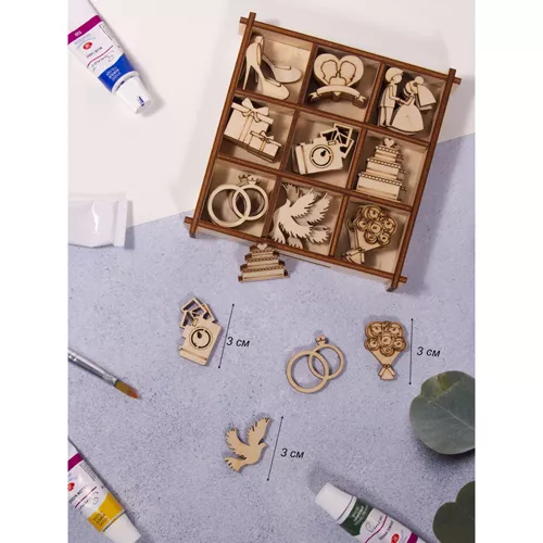 В наборе 9 дизайнов, по 4 украшения каждого вида. Средний размер 2,5х2,7 см. Деревянные фигурки упакованы в коробочку с ячейками, которую также можно использовать для воплощения творческих идей