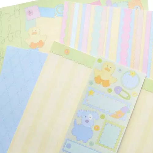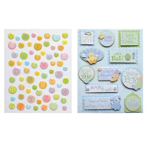 В наборе 6 листов бумаги 30х30 см, лист с наклейками (размер 12х29 см), лист с 3D-наклейками (размер 12х15 см), лист с эпоксидными наклейками-алфавитом (размер 12х15 см). Отлично подойдет для оформления детских фотоальбомов!