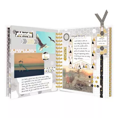 В набор входят: заготовка для артбука с твердой обложкой и 40 листами с дизайнерскими принтами, вся эта красивость скреплена пружиной цвета золота (размер обложки 19х22 см, толщина около 2 см), 10 скрепочек, 2 листа с наклейками и различные кармашки из бумаги. Получится очень стильный блокнот, отличный подарок творческому человеку или для себя любимого!