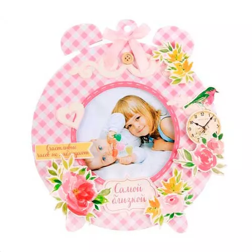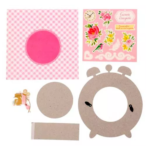 В набор входят картонная заготовка для фоторамки (размер рамки 17х21 см, размер фотографии 9,5х9,5 см), лист бумаги (размер 20х20 см), набор клеевых подушечек, набор высечек, 2 деревянные пуговки, несколько полужемчужин, атласный бантик и джутовый шнур
