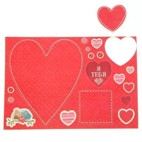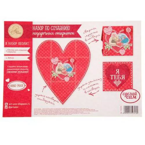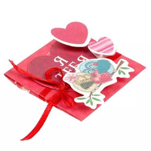 В комплект входит заготовка для конверта из плотной бумаги (размер готового конверта 5,5х5,5 см), разнообразные высечки для украшения, клеевая подушечка, атласная лента