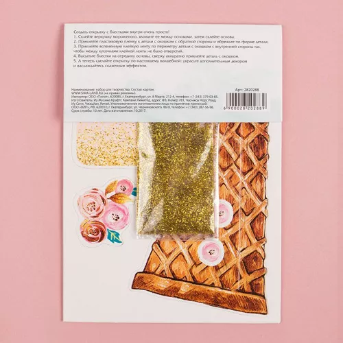 В набор входит заготовка для открытки, лист с высечками из плотной бумаги, пленка, клеевые подушечки, глиттер. Размер открытки в готовом виде 10х14 см