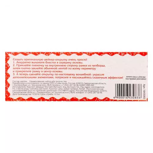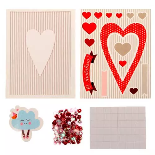 В набор входит заготовка для открытки, лист с высечками, пленка (размер 10х14,5 см), клеевые подушечки, пайетки. Размер открытки в готовом виде 13х10,5 см