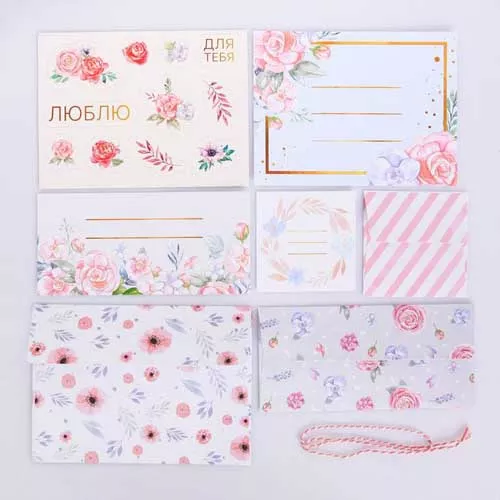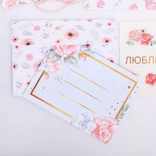 В наборе 3 односторонние карточки (размер 7,5х7,5 см, 7,7х16 см и 11,6х15,5 см), 3 конверта к карточкам из плотной бумаги, вырубки для украшения конвертов и витой шнур