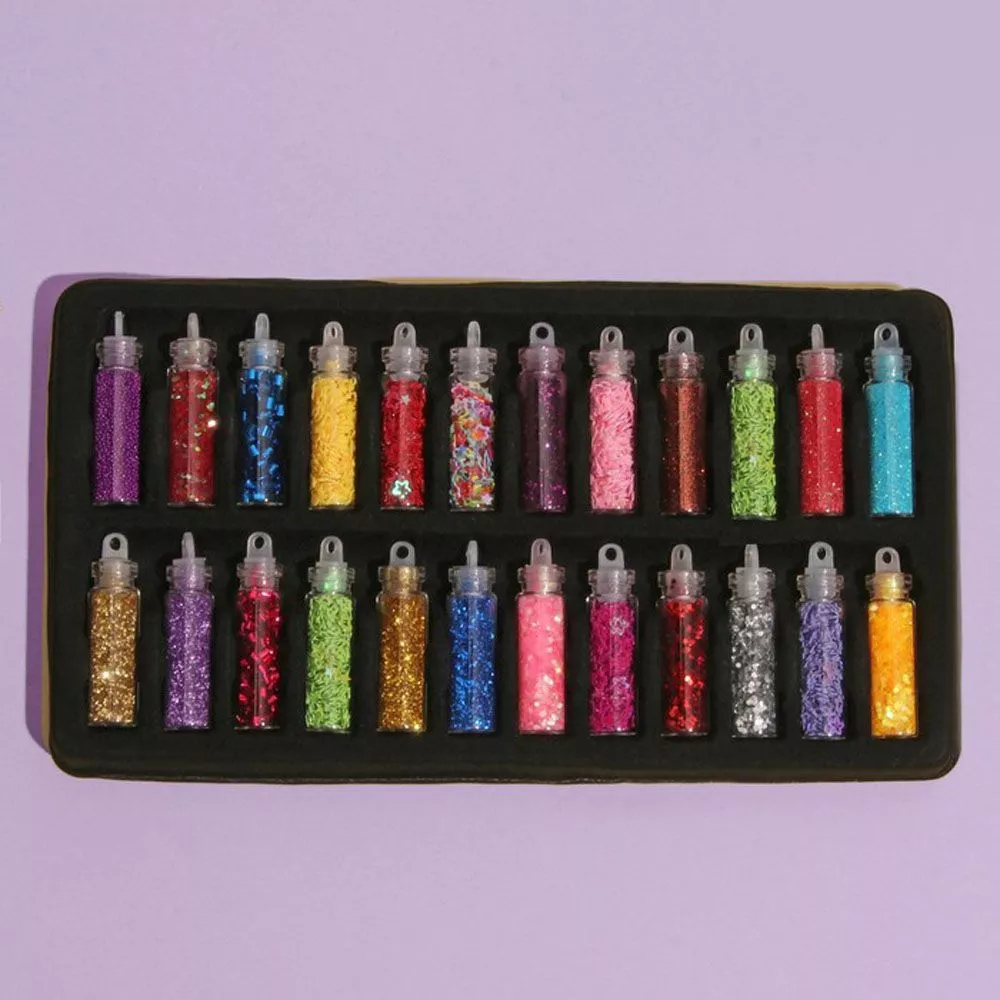 В наборе 24 стеклянные баночки с разноцветными украшениями. Можно использовать как наполнитель для шейкера или в качестве подвески на корешок блокнота. Каждый бутылек имеет плотную крышку с отверстием. Внимание! Соотношение цветов в упаковке может не совпадать с указанными на фото