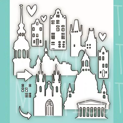 В наборе "Силуэты старого города" 13 ножей, размер вырубок от 0,7х0,9 см до 9х7,8 см