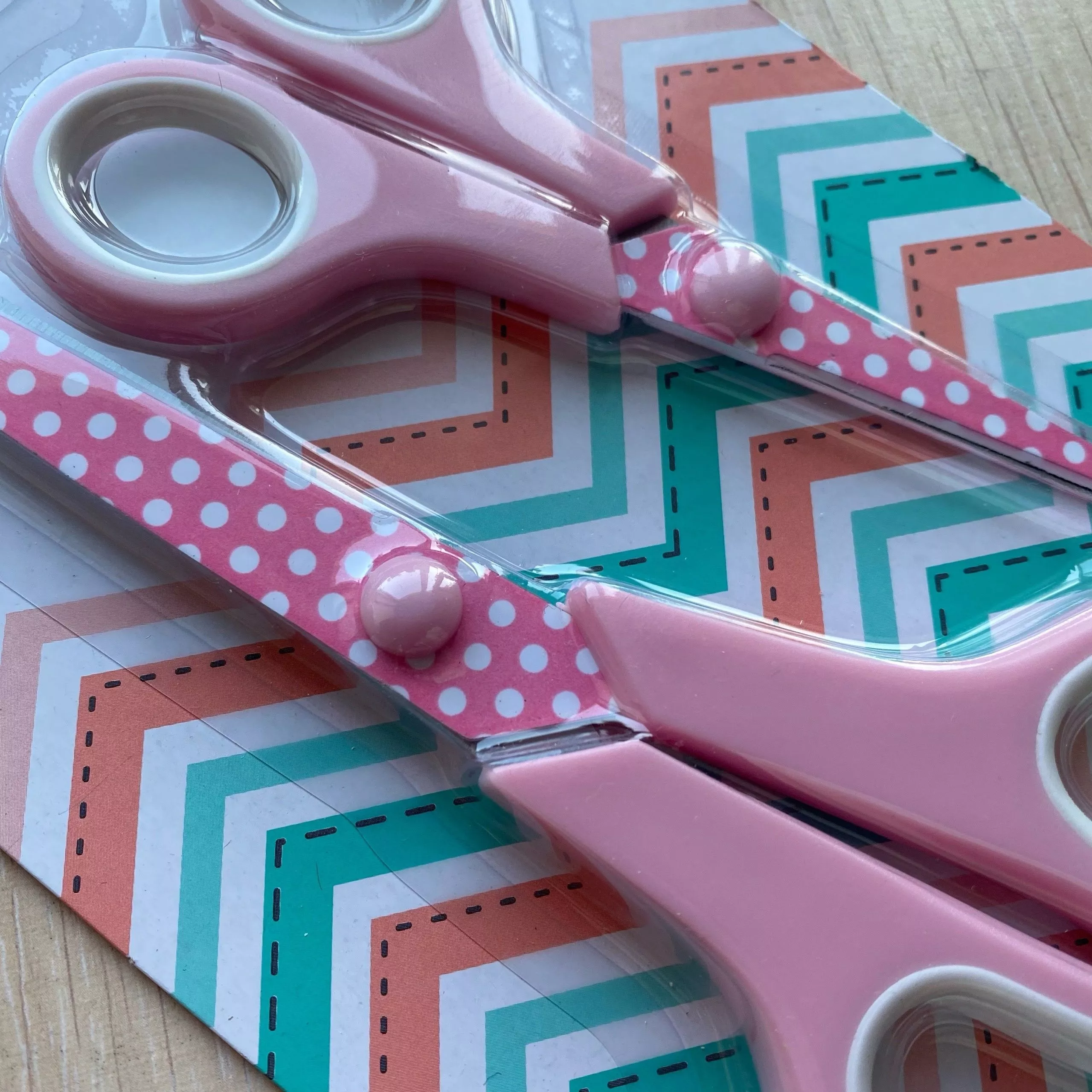 В наборе двое ножниц - универсальные и раскройные. Универсальные ножницы - длина лезвия 7,5 см, общий размер 14 см. Раскройные ножницы - длина лезвия 11 см, общий размер 21,6 см. Оба инструмента имеют пластиковые ручки со вставками из термопластичной резины для комфортного использования. Цвет пластиковых деталей и лезвий розовый в очаровательный белый горох