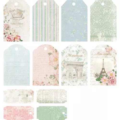 В наборе 12 ярлычков разного дизайна из плотной бумаги, размеры 5,9х9,3 см и 3,1х6,9 см