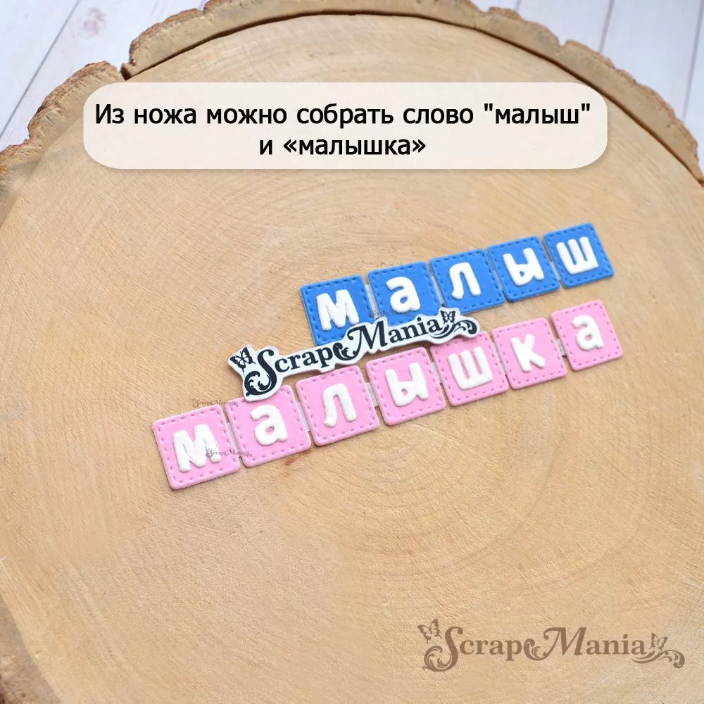 В наборе 2 ножа, соединенных перемычкой, которую при необходимости можно перекусить. Общий размер ножа 2,6х7,7 см. Размер пластины с квадратиками 1,6х7,8 см, размер пластины "малышка" 1,1х5,6 см. Размер вырубаемых квадратов 1,4х1,4 см, высота букв 0,8 см. Из ножа так же можно собрать слово "малыш". Идеальное дополнение к детским работам. Чудесный нож-конструктор позволит Вам проявить невероятную фантазию в своих работах. Компонуйте, меняйте, переставляйте местами вырубку и создавайте свой невероятный дизайн. Отлично сочетается с другими ножами из серии "Детство" (255654, 255656 и др)