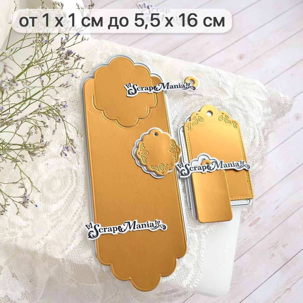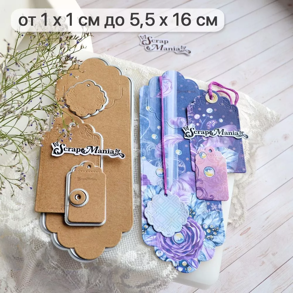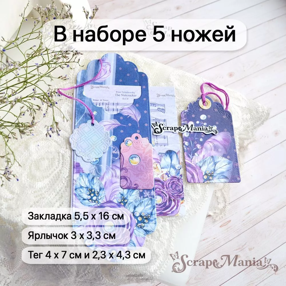 В наборе 5 ножей, соединенных перемычкой, которую при необходимости можно перекусить. Размер закладки 5,5х16 см, ярлычка 3х3,5 см, тега 4х6,5 см и 2,5х4,3 см, кружочка-люверса 1,1х1,1 см. Нож-конструктор позволит Вам проявить невероятную фантазию в своих работах. Компонуйте, меняйте, переставляйте местами вырубку и создавайте свой невероятный дизайн. Сочетайте с другими ножами из серии "Конверты"