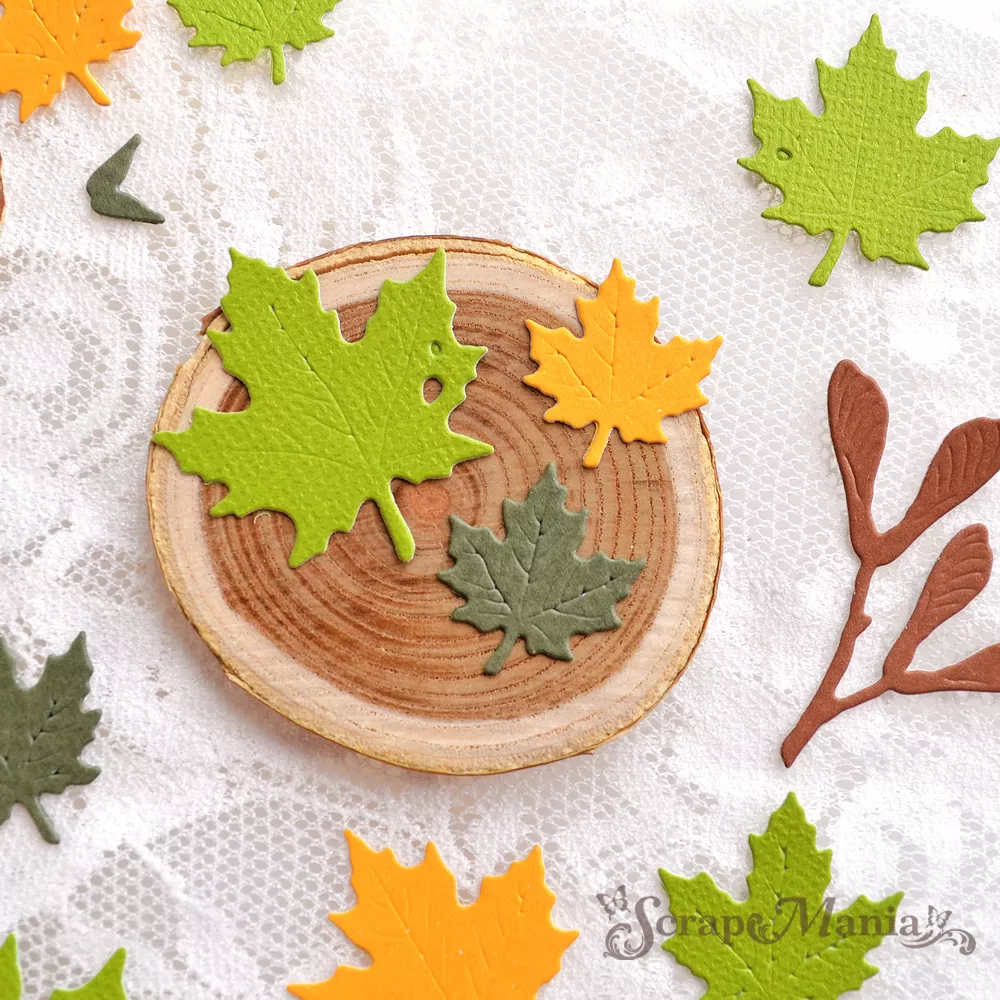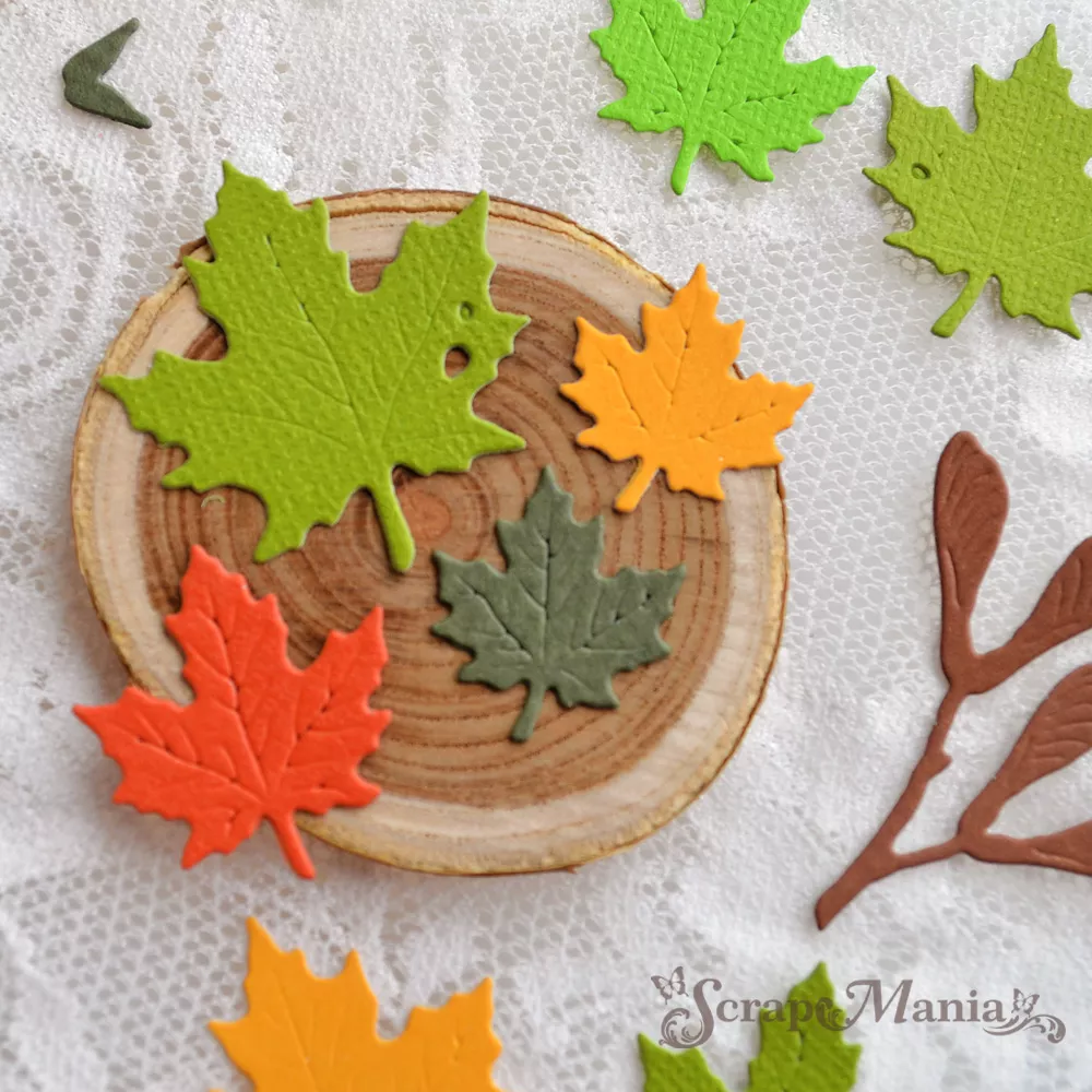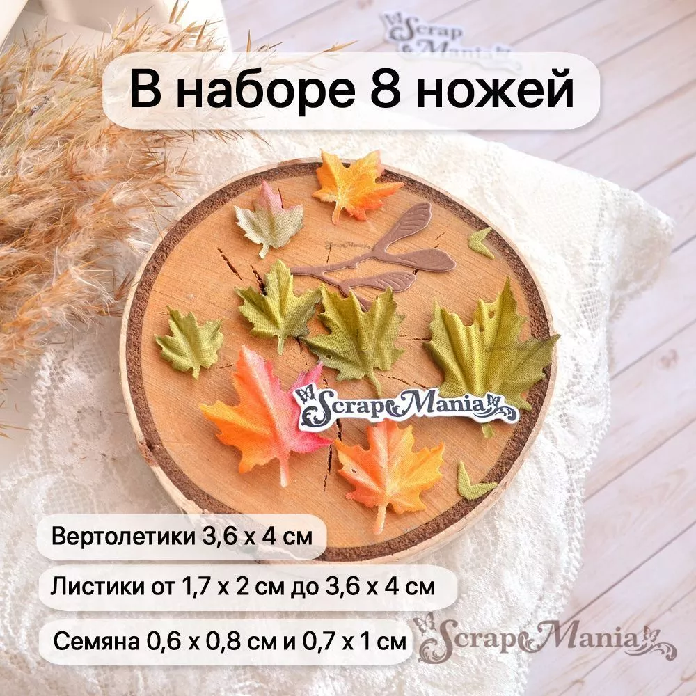 В наборе 7 ножей, соединенные перемычкой, которые при необходимости можно перекусить. Размер листьев 1,7х2 см, 2,2х2,5 см, 2,7х3 см, 3,2х3,5 см и 3,6х4 см. Размер "вертолетиков" 3,6х4 см, семян 1х0,7 см и 0,8х0,6 см. Общий размер ножа 8,6х7,8 см. Прекрасное дополнение к любым ботаническим композициям. Вырубка идеально подойдет на тему осенних мечтаний и к школьным работам