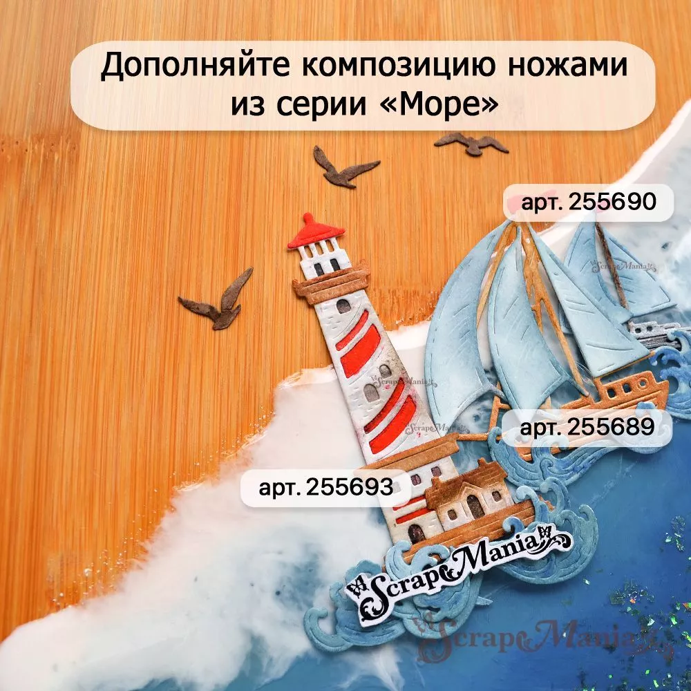 В наборе 9 ножей, соединенных перемычкой, которую при необходимости можно перекусить. Общий размер ножа 5,1х8 см. Размер маяка 0,9х1,5 см, 0,5х2,6 см, 0,8х1,9 см, 1,5х2,1 см, 0,7х4,3 см и 2х7,8 см, чаек 1,4х1,6 см (3 шт). Нож-конструктор прекрасно подойдет для создания декора к самым разным страничкам, летним, морским работам, а также идеально впишутся в работу про воспоминания об отпуске на море. Отлично сочетается с другими ножами "Море", "Пляж" и с нашими коллекциями бумаги "Море, я скучала", "Мой капитан", "Океания" и "Морячок"