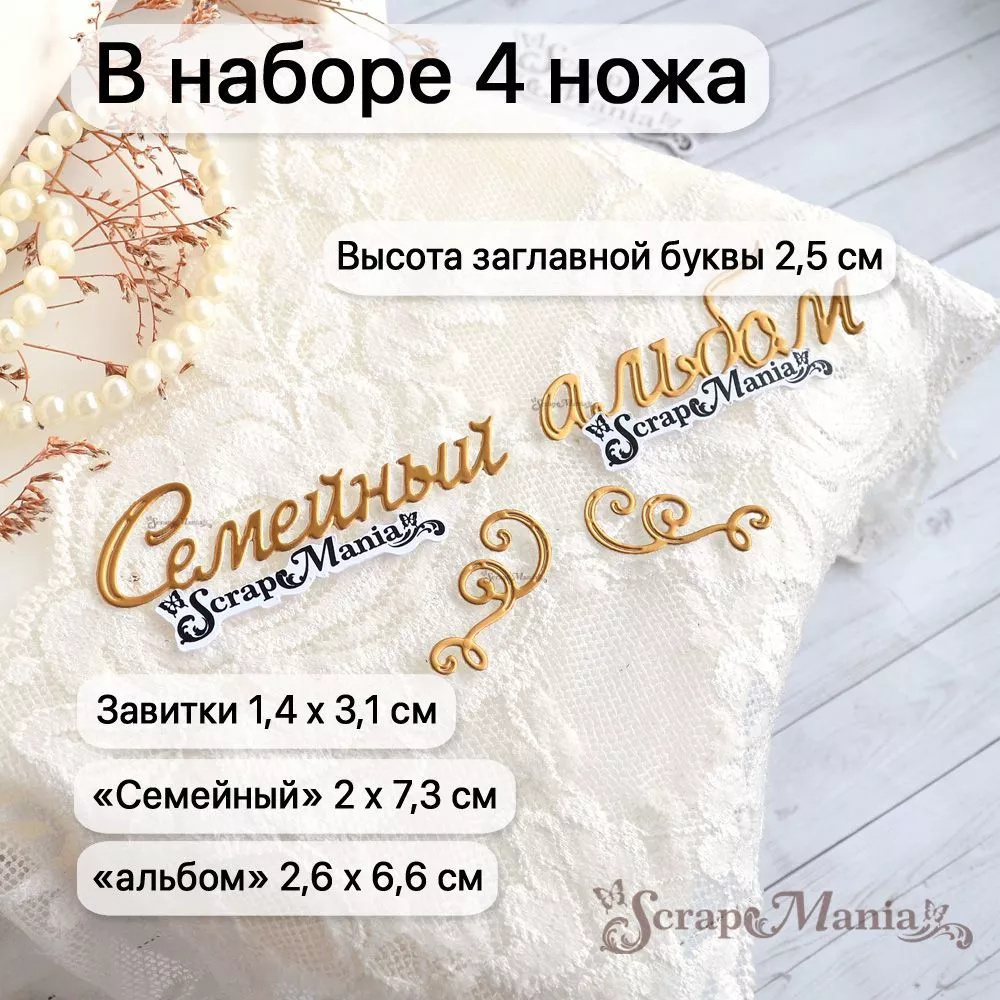 В наборе 4 ножа. Общий размер 4,2х10,4 см. Размер слов: "Семейный" 2х7,3 см, "альбом" 2,6х6,6 см, размер завитков 1,4х3,1 см (2 шт). Классическая надпись с изящными завитками прекрасно дополнит обложку семейного альбома