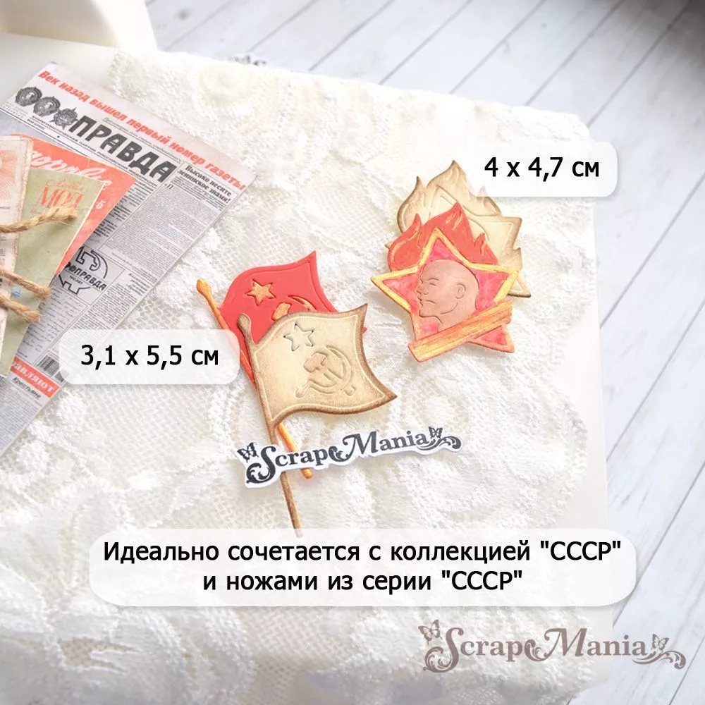 В наборе 2 ножа, соединенных перемычками, которые при необходимости можно перекусить. Общий размер ножа 5,7х7,4 см. Размер флага 2,8х5,2 см, значка пионера 4х4,7 см. Нож отлично подойдет для создания ретро альбомов, открыток и страничек. Сочетается с коллекцией "СССР" и ножами из серии "СССР" (арт. 255336, 255338, 255339, 255340), отлично дополнит композицию, собранную из вырубки этой серии