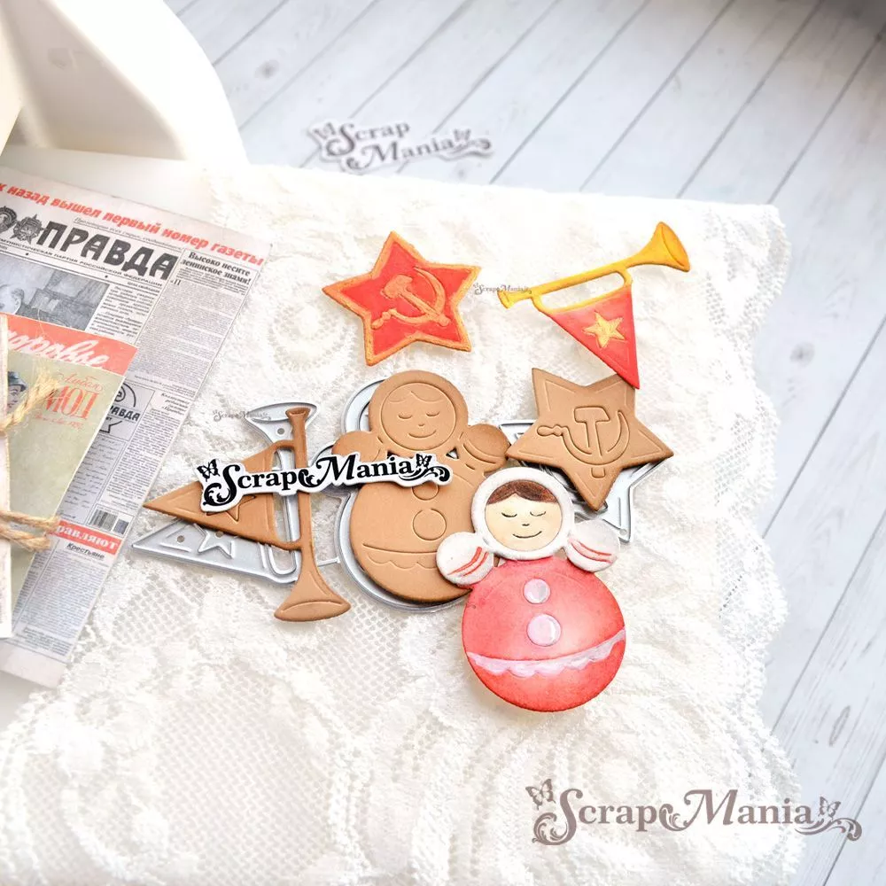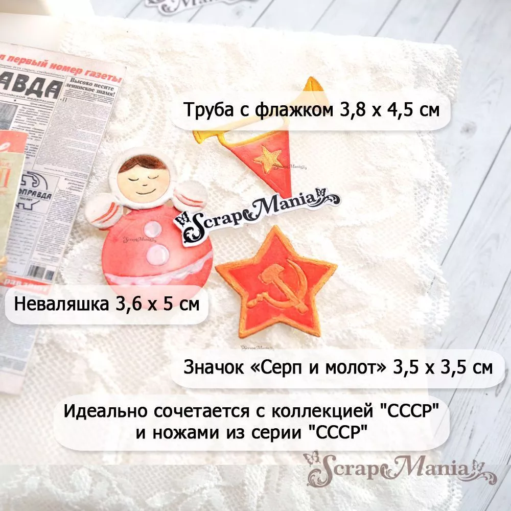 В наборе 3 ножа, соединенных перемычкой, которую при необходимости можно перекусить. Размер трубы с флажком - 3,8х4,5 см, неваляшки - 3,6х5 см и значка "Серп и молот" - 3,5х3,5 см. Общий размер ножа 10,9х5,2 см. Отлично подойдет для создания ретро альбомов, открыток и страничек. Сочетается с коллекцией "СССР" и ножами из серии "СССР" (арт. 255183, 255184, 255185 и 255186), отлично дополнит композицию, собранную из вырубки этой серии