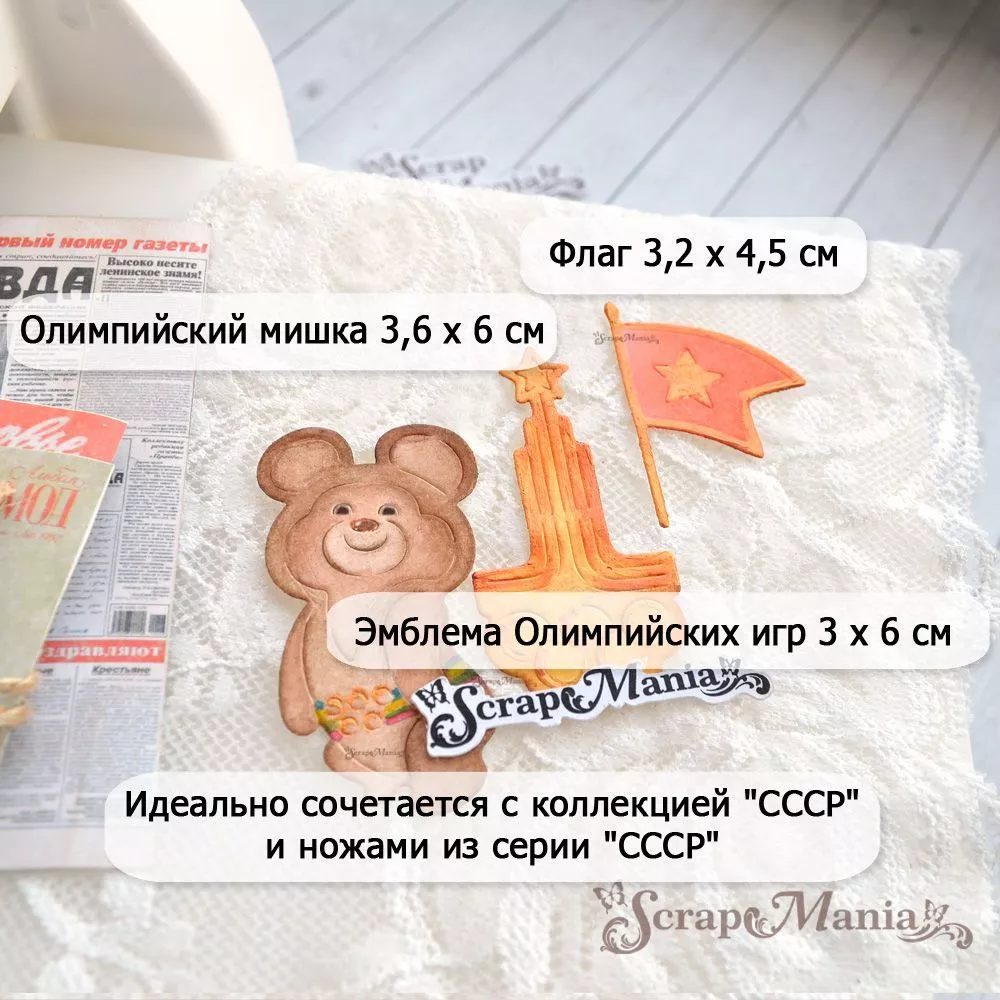 В наборе 3 ножа, соединенных перемычкой, которую при необходимости можно перекусить. Общий размер ножа 9,7х6,3 см. Размер флага - 3,2х4,5 см, олимпийского мишки - 3,6х6 см, эмблемы Олимпийских игр - 3х6 см. Отлично подойдет для создания ретро альбомов, открыток и страничек. Сочетается с коллекцией "СССР" и ножами из серии "СССР" (арт. 255183, 255184, 255185 и 255187), отлично дополнит композицию, собранную из вырубки этой серии