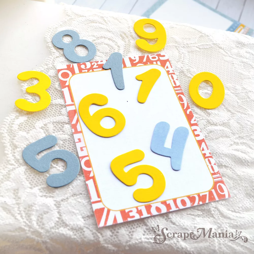Общий размер ножа 12,5х6,3 см. В наборе 13 ножей, соединенных перемычкой, которые при необходимости можно разрезать. Размер цифр 3х2,2 см, размер знаков от 0,5х1,6 см. Отлично подойдет для оформления планеров, ежедевников и ярлычков, а также детских альбомов