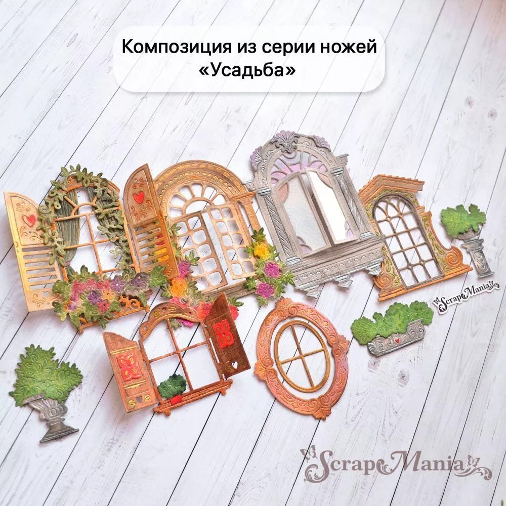В наборе 4 ножа, соединенных перемычкой, которую при необходимости можно перекусить. Общий размер 7,5х12,1 см. Размер окна 7,3х10,5 см, декоративных элементов 0,8х2 см (2 шт) и 1,6х2,1 см. Идеальное дополнение к цветочным и деревенским работам. Чудесный нож-конструктор позволит Вам проявить невероятную фантазию в своих работах. Ставни на окнах открываются и закрываются, для этого их необходимо подрезать сверху и снизу. Компонуйте, меняйте, переставляйте местами вырубку и создавайте свой невероятный дизайн. Дополняйте композицию ножами из серии "Усадьба" (арт. 255308, 255309, 255310, 255312 и т.д.). А так же сочетайте с ножами из серии "Палисадник", Цветочный магазин" и "Цветочный комплимент"