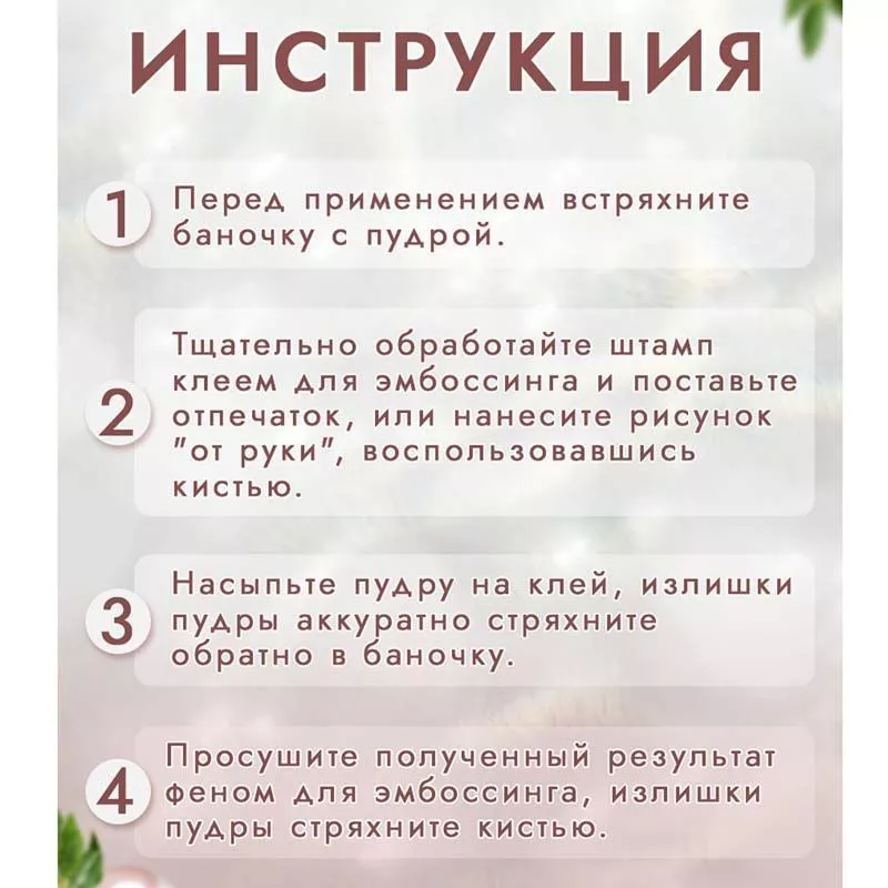 При запекании пудра создает непрозрачное покрытие с легкой текстурой. Способ применения: нанесите клей для эмбоссинга на штамп или нарисуйте кистью на поверхности задуманный рисунок, затем нанесите пудру для эмбоссинга, пудра останется только там, где был нанесен клей, излишки пудры стряхните обратно в баночку. После этого, нагрейте полученный оттиск феном для горячего эмбоссинга, пока пудра полностью не расплавится