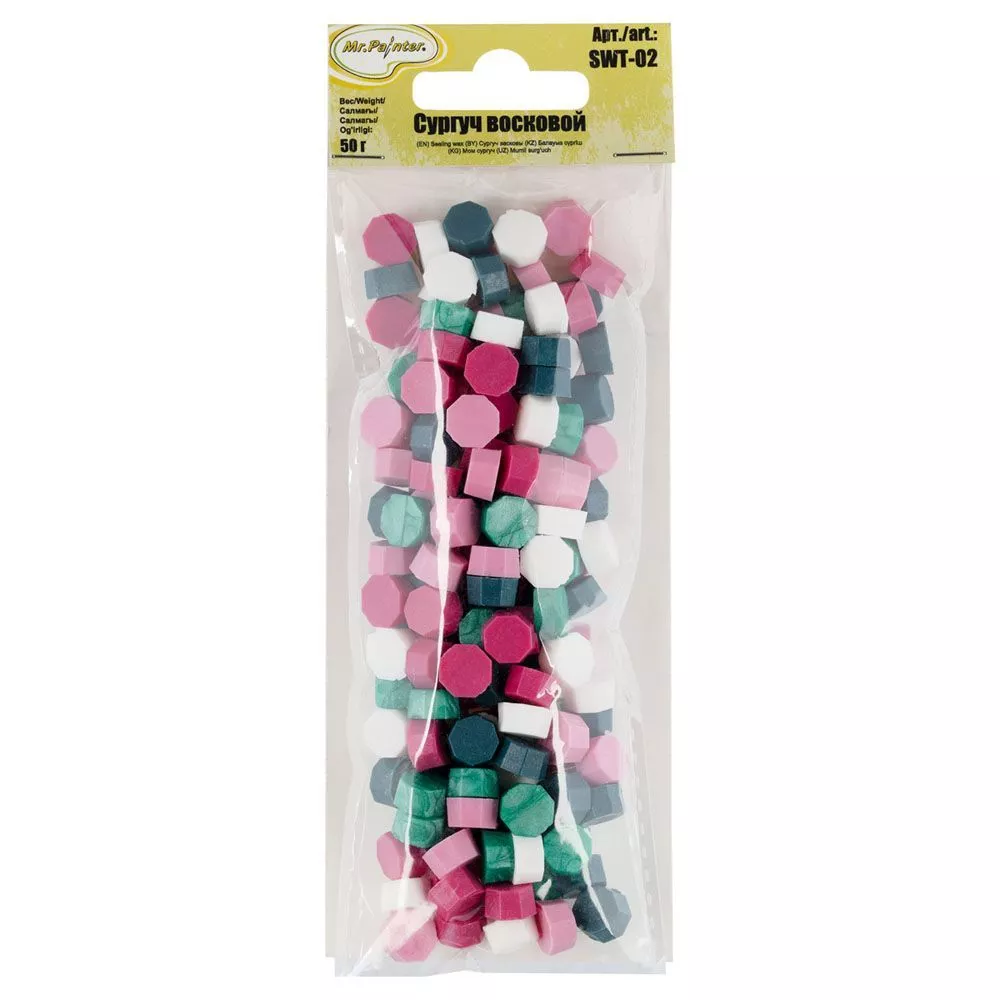 В пакете 50 грамм сургуча или 160 штучек (цвета белый, розовый, зеленый). Вес одного восьмиугольника примерно 0,35 гр, размер 1х1 см, толщина 0,6 мм. Благодаря компактным гранулам очень легко и быстро создать красивый оттиск печати. На стандартную печать 3,5 см требуется примерно 4 восьмиугольника