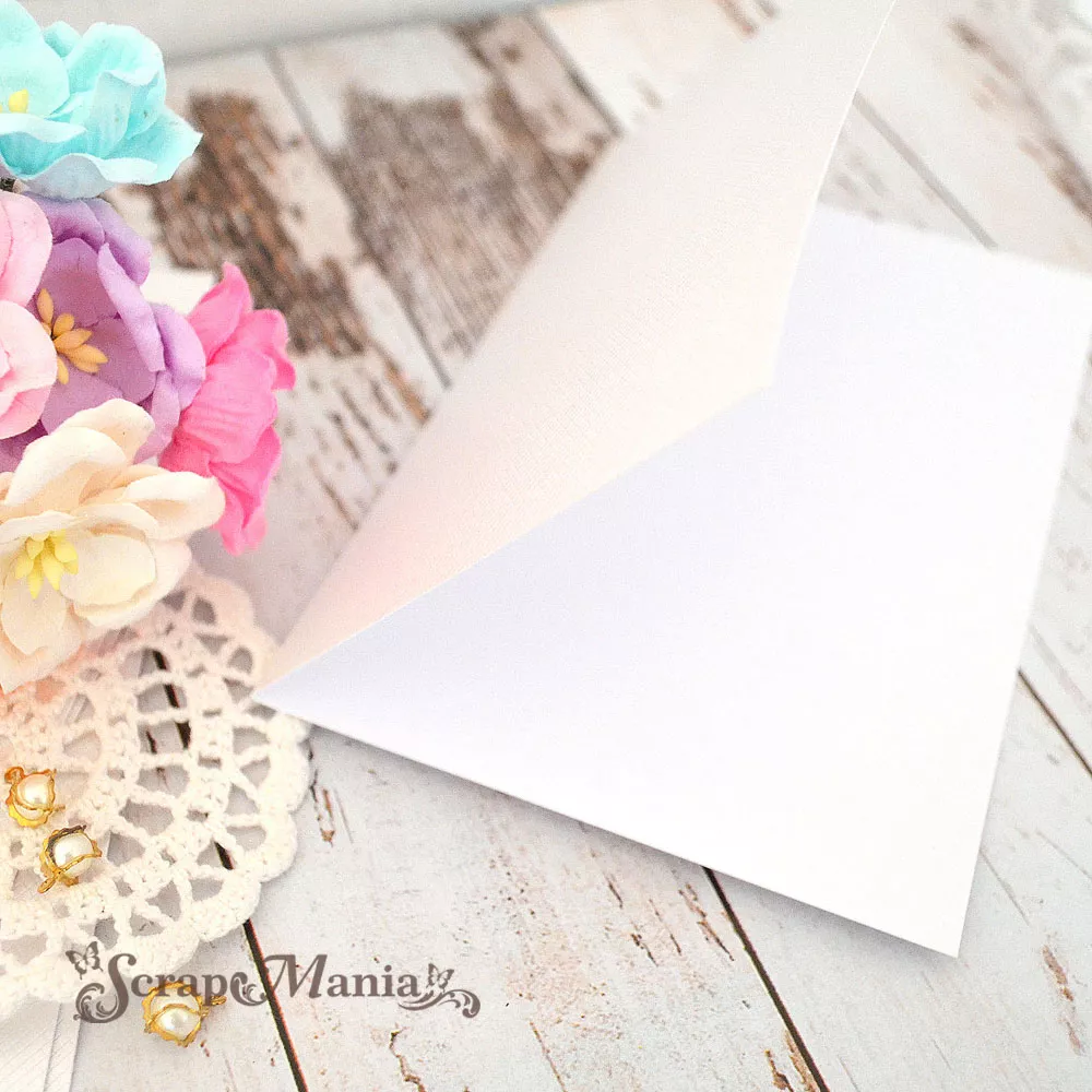 Размер заготовки в сложенном виде 10х15 см, в развернутом виде 20х15 см. Плотная бумага с перламутровой поверхностью и односторонним тиснением "плетёная сеть", плотность 215 г/м2. Не содержит лигнина. Текстура придаст открыткам романтичность и создаст эффект кружевной сетки