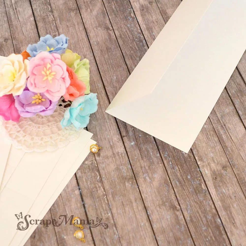 Размер заготовки в сложенном виде 8,5х22 см, в развернутом виде 17х22 см. Плотная бумага с перламутровой поверхностью и двусторонним покрытием. Плотность 290 г/м2. Не содержит лигнина. Кремовый оттенок и нежное жемчужное сияние - отличное начало трогательной открытки. Размер заготовки позволяет использовать ее не только для создания открыток и приглашений, но и как основу рассадочных карточек
